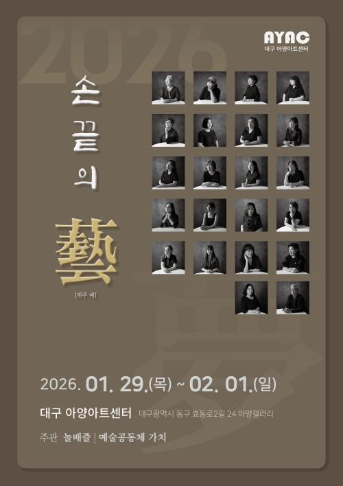 전시일정 이달전시 상세검색 캘린더 검색 초기화 전시구분 전체 대관 기획 장르 전체 조각 회화 현대미술 디자인 기타 전시상태 전체 전시중 준비중 전시장 전체 아양갤러리 로비갤러리 이전달 2026 다음달 검색결과 총 4 건 로비갤러리 기획 지역 우수작가 지원사업 「이슬 초대전」 전시일정 2025-12-10(수) ~ 2026-02-28(토) 전시시간 10:00~19:00 상세보기 관심전시 아양갤러리 대관 놀배즐: 손끝의 예 전시일정 2026-01-29(목) ~ 2026-02-01(일) 전시시간 상세보기 관심전시 아양갤러리 대관 아트스타: 작은 Big전 전시일정 2026-02-04(수) ~ 2026-02-08(일) 전시시간 상세보기 관심전시 아양갤러리 기획 미술단체 네트워크 강화 교류사업 「여류100호회 · 단묵여류한국화회 교류전」 전시일정 2026-02-25(수) ~ 2026-03-08(일) 전시시간 10:00~19:00 상세보기 관심전시 맨처음1맨마지막