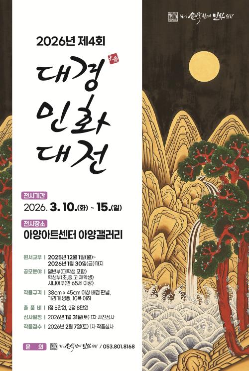전시일정 이달전시 상세검색 캘린더 검색 초기화 전시구분 전체 대관 기획 장르 전체 조각 회화 현대미술 디자인 기타 전시상태 전체 전시중 준비중 전시장 전체 아양갤러리 로비갤러리 이전달 2026 다음달 검색결과 총 5 건 아양갤러리 기획 미술단체 네트워크 강화 교류사업 「여류100호회 · 단묵여류한국화회 교류전」 전시일정 2026-02-25(수) ~ 2026-03-08(일) 전시시간 10:00~19:00 상세보기 관심전시 로비갤러리 기획 지역 우수작가 지원사업 「박철준 초대전」 전시일정 2026-03-04(수) ~ 2026-05-17(일) 전시시간 10:00~19:00 상세보기 관심전시 아양갤러리 대관 제4회 대경민화대전 전시일정 2026-03-10(화) ~ 2026-03-15(일) 전시시간 10:00~19:00 상세보기 관심전시 아양갤러리 대관 동국대 불교문화대학원 석사학위 청구전 전시일정 2026-03-17(화) ~ 2026-03-22(일) 전시시간 10:00~19:00 상세보기 관심전시 아양갤러리 기획 2026 동촌벚꽃예술제: 팔공산예술인회 초대전 전시일정 2026-03-25(수) ~ 2026-04-05(일) 전시시간 10:00~19:00 상세보기 관심전시 맨처음1맨마지막