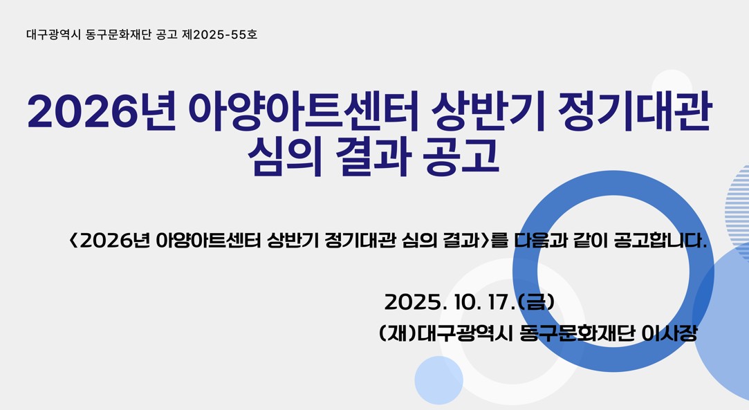 공지사항 공지사항 채용 공지사항 2026년 아양아트센터 상반기 정기대관 심의 결과 공고 2025.10.17 조회수243 2026년 상반기 정기대관 승인 결과(공고용).pdf prev 2026년 아양아트센터 상반기 정기대관 접수 공고 LIST next 다음글이 없습니다.