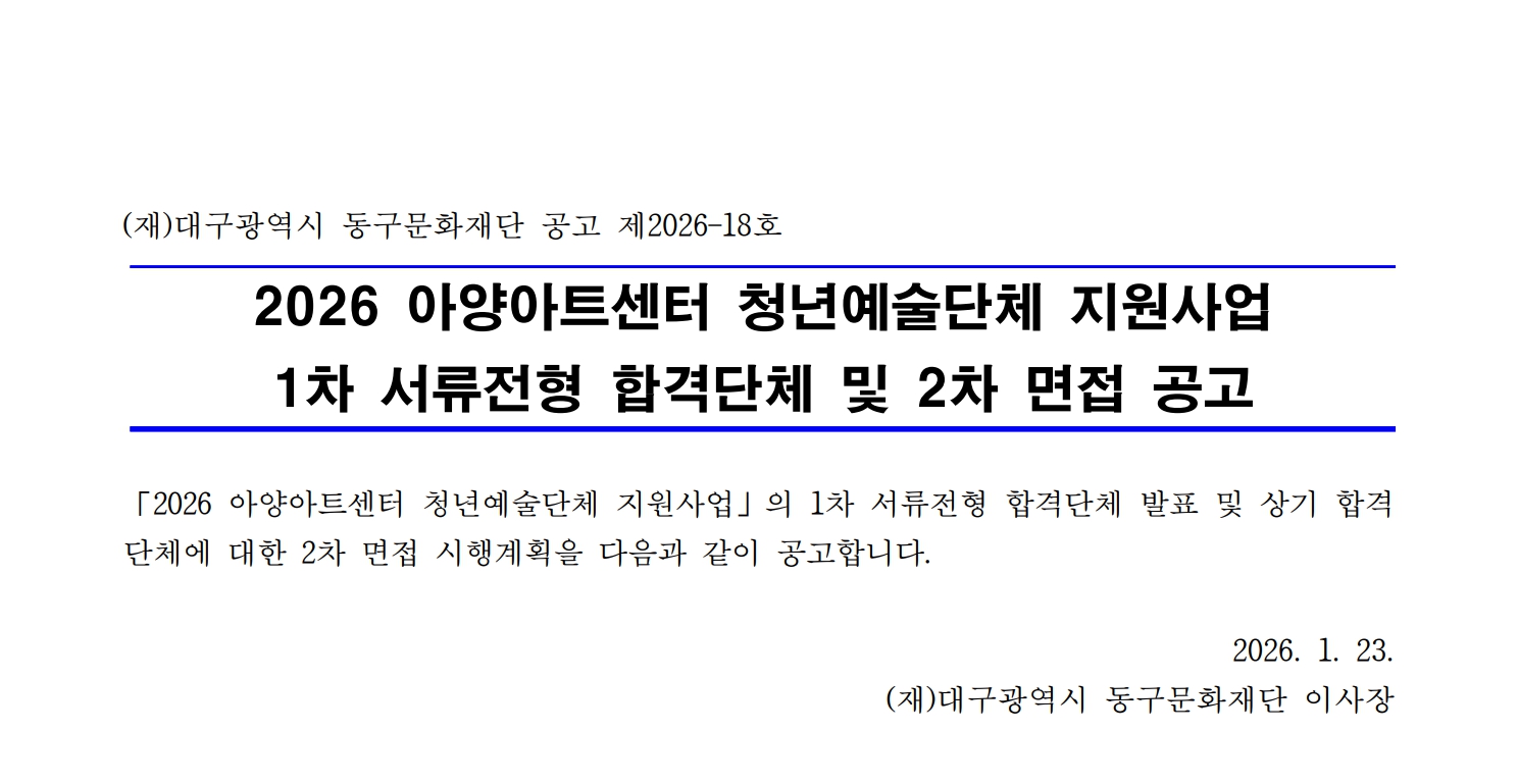 공지사항 공지사항 채용 공지사항 2026 아양아트센터 청년예술단체 지원사업 1차 서류전형 합격단체 및 2차 면접 공고 2026.01.23 조회수222 2026 아양아트센터 청년예술단체 지원사업 1차 서류전형 합격단체 및 2차 면접 공고.pdf prev 2026 동구합창단 단원모집 공고 LIST next 2026 아양아트센터 2기 SNS 홍보단 합격자 공고