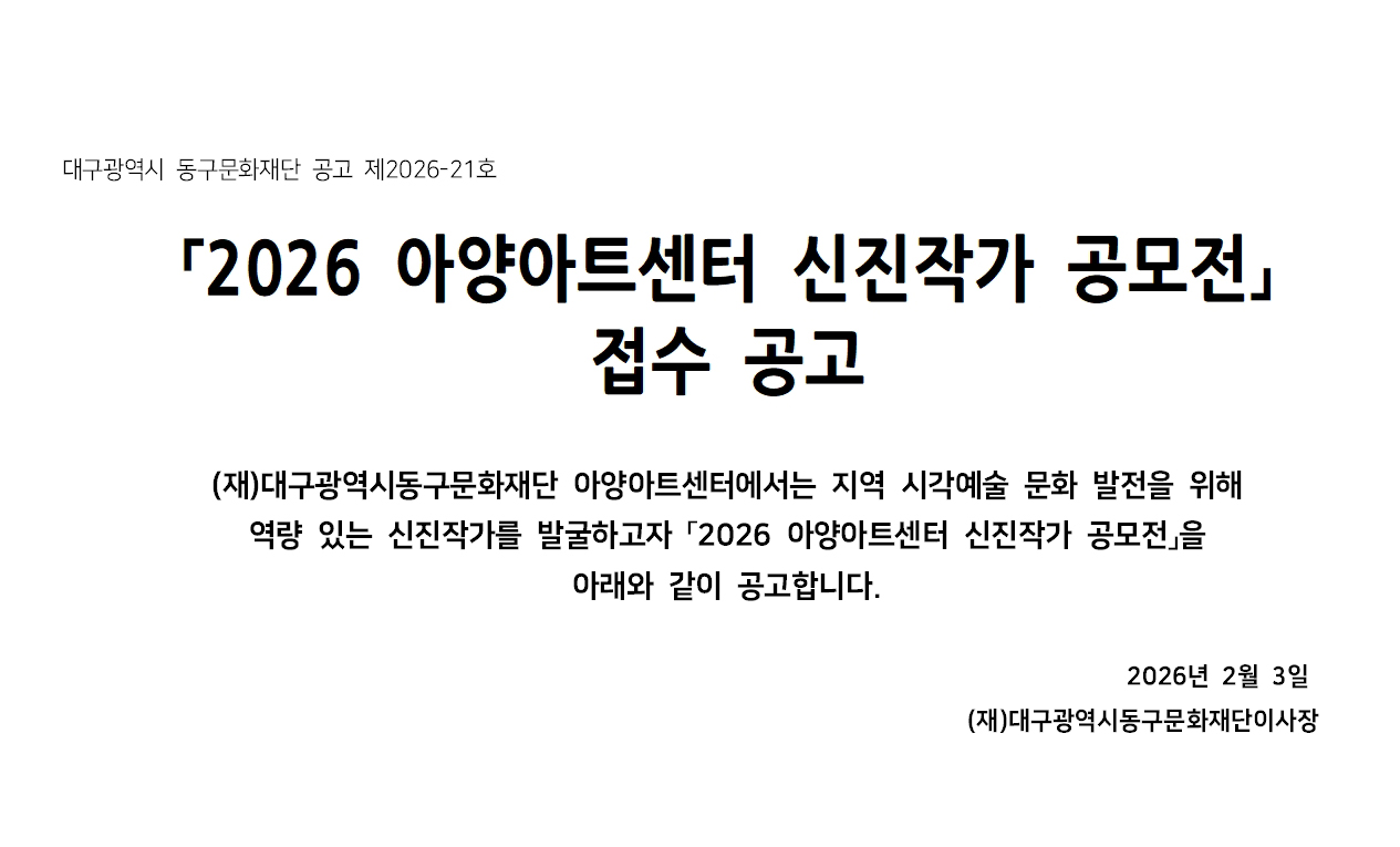 공지사항 공지사항 채용 공지사항 「2026 아양아트센터 신진작가 공모전」 접수 공고 2026.02.03 조회수91 『2026 아양아트센터 신진작가 공모전』 공고 및 지원신청서.hwp prev 2026 아양아트센터 청년예술단체 지원사업 선정 단체 공고 LIST next 다음글이 없습니다.
