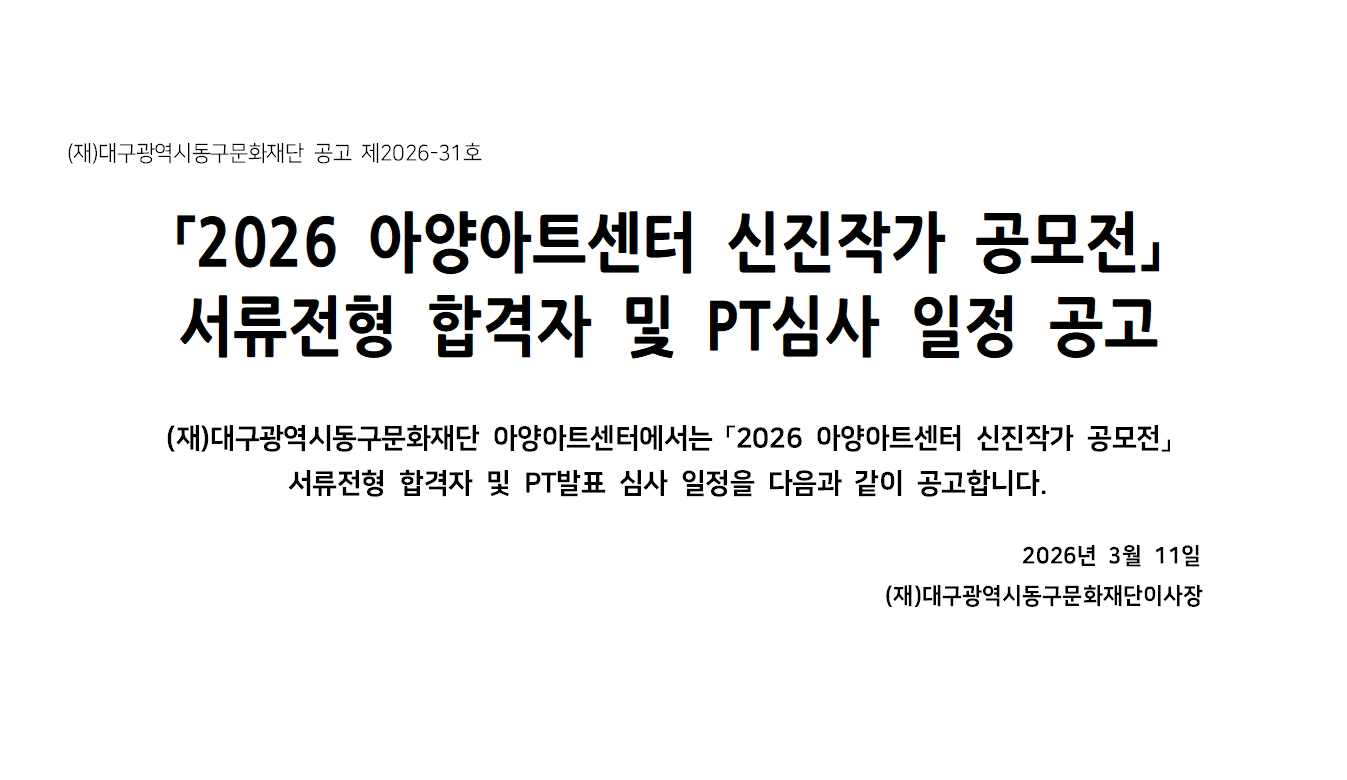 공지사항 공지사항 채용 공지사항 「2026 아양아트센터 신진작가 공모전」 서류전형 합격자 및 PT심사 일정 공고 2026.03.11 조회수58 『2026 아양아트센터 신진작가 공모전』 서류전형 합격자 및 발표심사 일정 공고.pdf prev 아양아트센터 아양홀 LED 조명기 구매 제안서 평가위원(후보자) 모집 공고 LIST next 다음글이 없습니다.