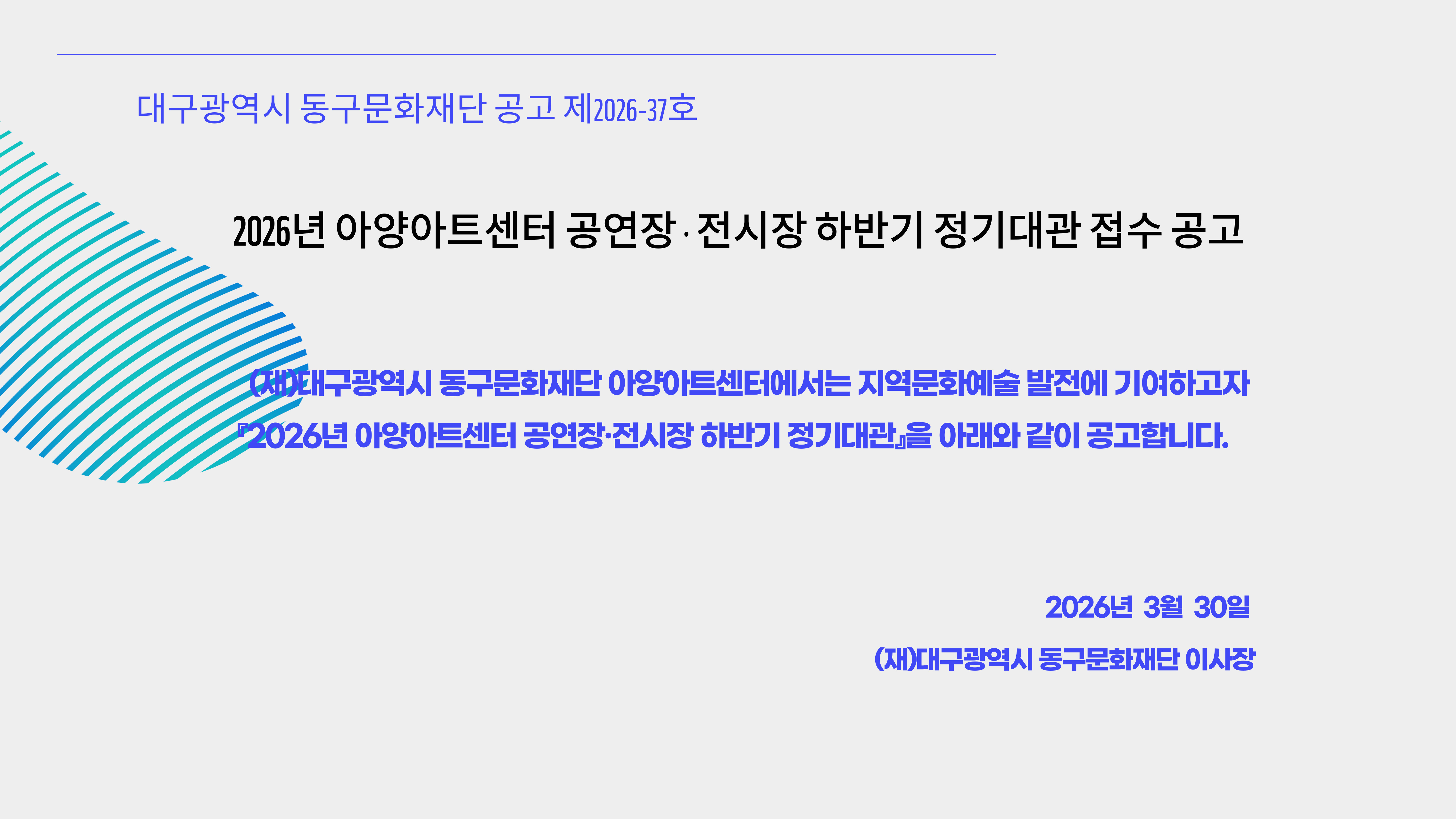 공지사항 공지사항 채용 공지사항 2026년 아양아트센터 하반기 정기대관 접수 공고 2026.03.30 조회수140 2026년 아양아트센터 하반기 정기대관 공고문.pdf71419_아양홀_사용승인신청서.hwp67128_아양갤러리_사용승인신청서.hwp prev 「2026 아양아트센터 신진작가 공모전」 심의결과 발표 LIST next 다음글이 없습니다.