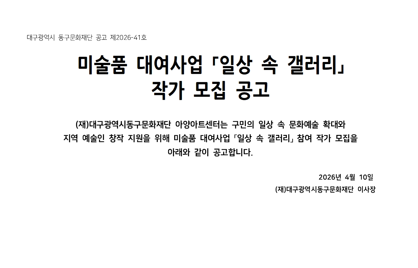 공지사항 공지사항 채용 공지사항 미술품 대여사업 「일상 속 갤러리」 작가 모집 공고 2026.04.10 조회수22 미술품 대여사업 「일상 속 갤러리」 작가 모집 공고 및 지원신청서.hwp prev 2026년 아양아트센터 하반기 정기대관 접수 공고 LIST next 다음글이 없습니다.